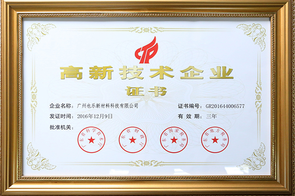 新豐也樂化學工業制造有限公司變更為廣東也樂新材料制造有限公司,并獲得廣東省供應鏈管理試點企業;同年,廣州也樂新材料科技有限公司榮獲廣東省高新技術企業。